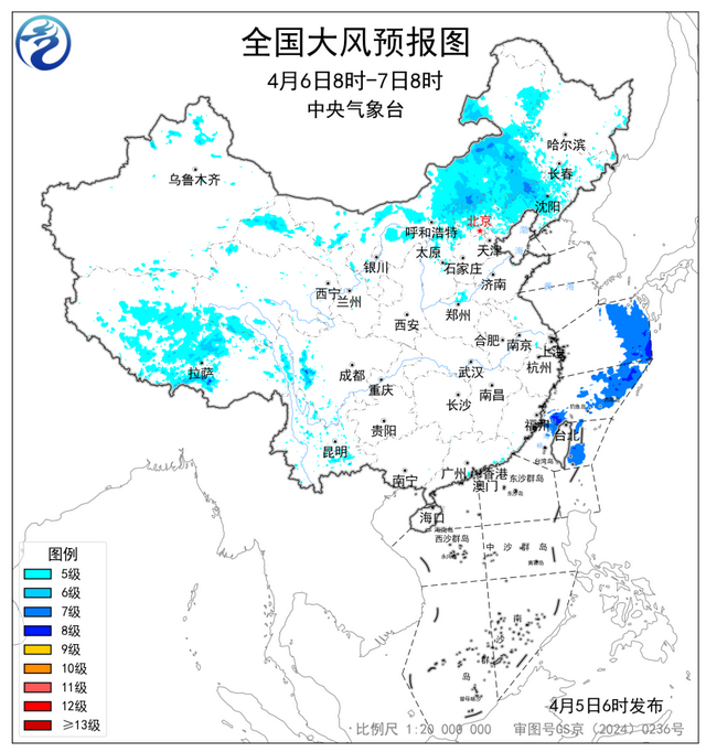 6日8时至7日8时,内蒙古中东部、山西北部、河北北部、辽宁大部、吉林南部、新疆北部、甘肃西部、青海南部、西藏中部、川西高原、云南南部等地部分地区有5~7级风,阵风7~9级。台湾以东洋面、东海东部海域将有7~8级、阵风9级的大风。