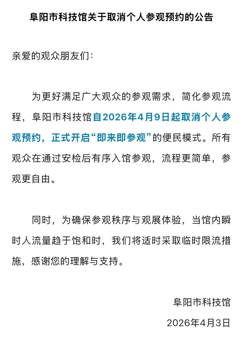 阜阳一场馆公告:取消个人参观预约!