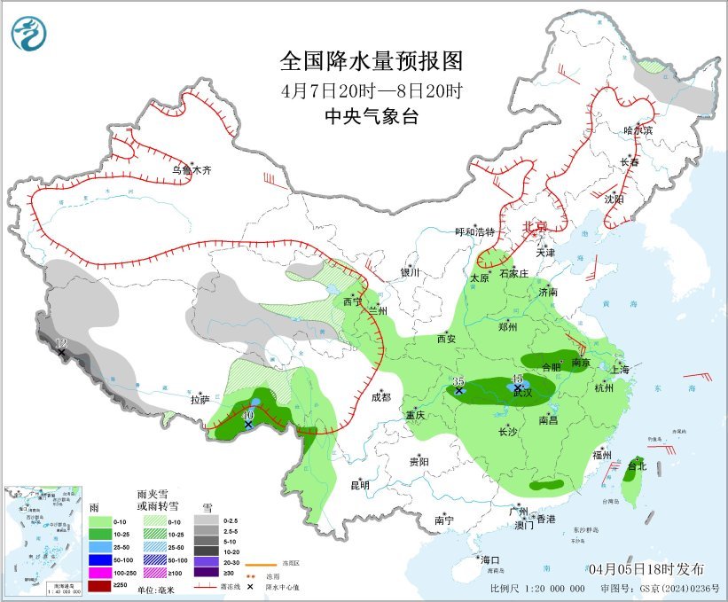 图4 全国降水量预报图(4月6日20时-7日20时)