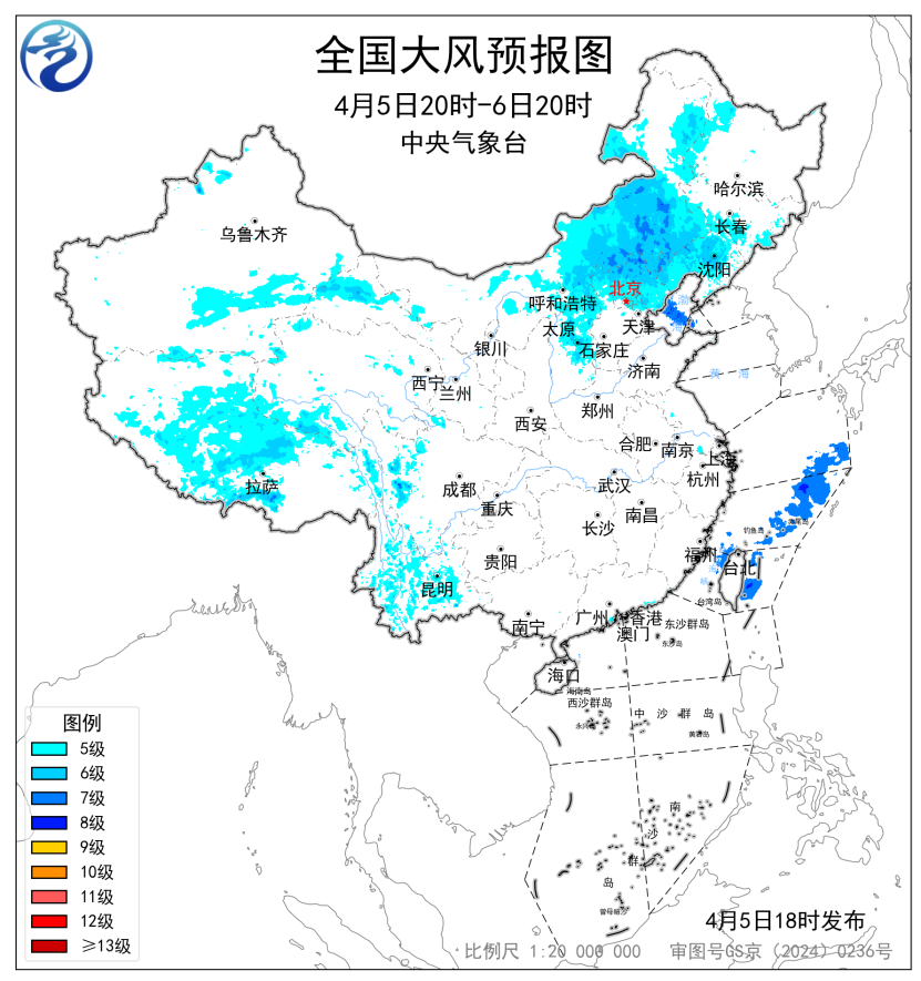 中央气象台4月5日18时继续发布大风蓝色预警。预计,4月5日20时至6日20时,内蒙古中东部、华北北部和西部、辽宁大部、吉林东部以及新疆南疆盆地、甘肃西部、川西高原北部、西藏中西部、云南等地部分地区有5~7级风,阵风7~9级,局地阵风10级以上;渤海、渤海海峡、东海东部部分海域、台湾以东洋面将有7~8级、阵风9~10级的大风(见图2)。