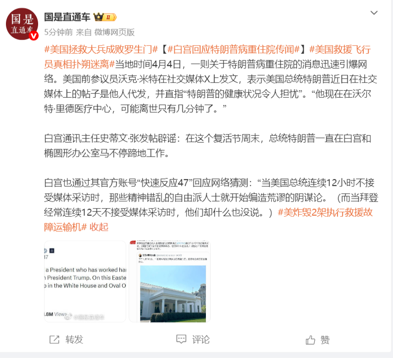 当地时间4月4日,一则关于特朗普病重住院的消息迅速引爆网络。美国前参议员沃克·米特在社交媒体X上发文,表示美国总统特朗普近日在社交媒体上的帖子是他人代发,并直指“特朗普的健康状况令人担忧”。“他现在在沃尔特·里德医疗中心,可能离世只有几分钟了。”