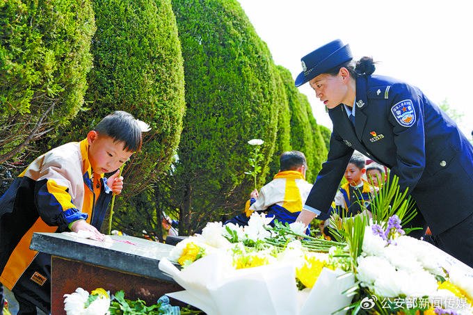 4月1日,安徽省芜湖市公安局繁昌分局组织民警辅警来到芜湖市烈士陵园,与到现场开展祭奠活动的小学生一起,以庄重仪式致敬公安英烈,汲取奋进力量。 图为民警和小学生向牺牲民警的墓碑献花。 侯迪摄