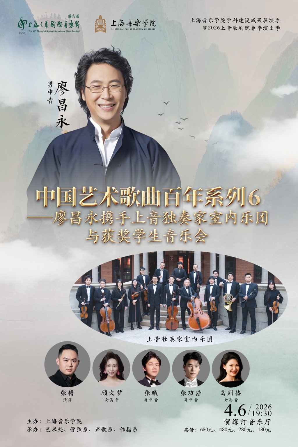 4月6日,在第41届“上海之春”国际音乐节上,上海音乐学院院长、男中音歌唱家廖昌永将与青年指挥家张橹一道,携手上音独奏家室内乐团演绎中国艺术歌曲百年系列音乐会。
