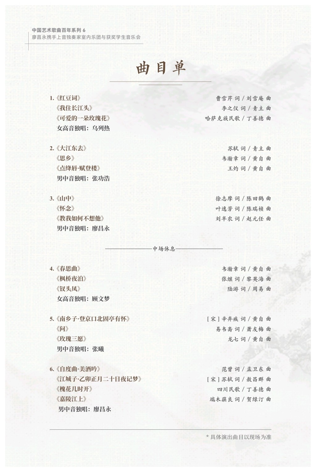 不同于其他聚焦于某一创作时期,或集中于某一题材类型的艺术歌曲音乐会,本场中国艺术歌曲盛宴的曲目单,汇集了自20世纪20年代以来相关创作领域的19首经典之作。其词作文本既有撷取古典诗词,又有选自现代诗文,抑或源自民间歌谣,几乎涵盖了中国艺术歌曲选词的所有主流方式;曲作风格方面则显示了几代作曲家们逐步摆脱对德奥艺术歌曲风格模仿,通过将中西作曲技法与中国民族文化、语言韵律与传统旋律深度融合,寻觅出具有世界影响力的中国化路径之变迁,并带领他们全面回望中国之声的百年求索之路。