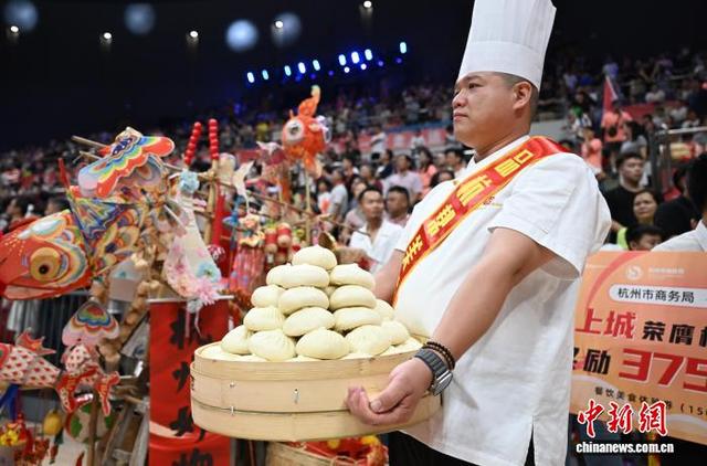 2025年7月27日,工作人员为获得亚军的上城队准备包子等奖品。当日,浙江省城市篮球联赛(浙BA)杭州赛区冠军赛在拱墅区运河体育公园体育馆举行。 中新社记者 王刚 摄