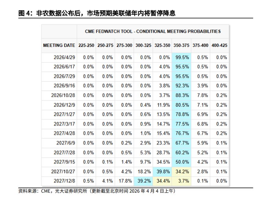 在此背景下,3月数据公布后,市场已基本抹除美联储年内降息的预期,而中东冲突爆发前市场一度定价55个基点的宽松预期。