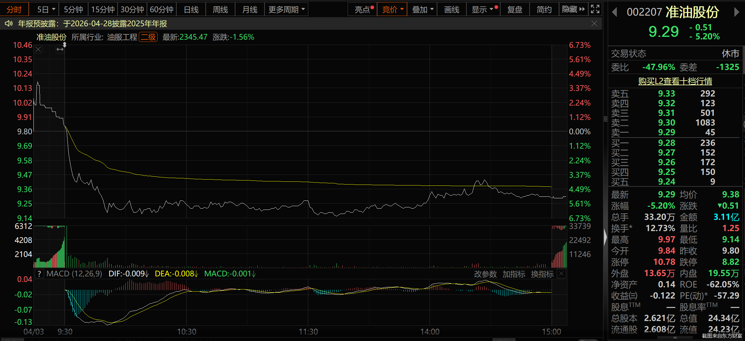 二级市场上,准油股份2025年12月17日盘中触及6.95元/股的低价后,股价震荡走高,一度在今年3月5日盘中涨至16.01元/股,随后股价回落。截至4月3日收盘,公司股价收跌5.2%,报9.29元/股,市值24.34亿元。