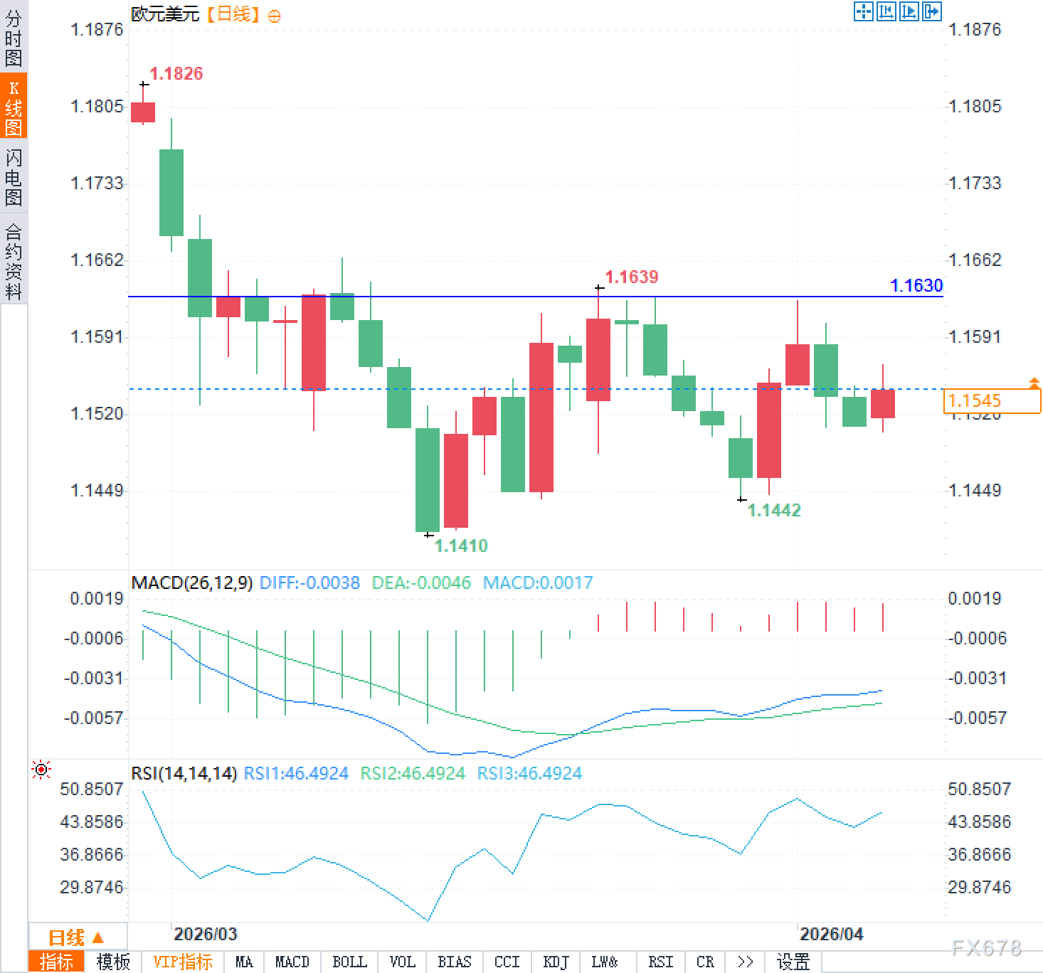 欧元兑美元目前仍受困于1.1505至1.1570的窄幅区间,布林带收窄显示波动率处于低位。RSI指标在中性区域徘徊,缺乏明确超买或超卖信号。MACD柱状线虽小幅正向,但动能不足以推动突破。若停火谈判取得实质进展,该区间上沿1.1570有望成为短期测试目标;反之,若特朗普表态进一步加剧紧张,1.1505支撑位将再次面临考验。整体而言,技术面暂无趋势性信号,区间交易逻辑主导,直至地缘或宏观数据带来明确催化剂。