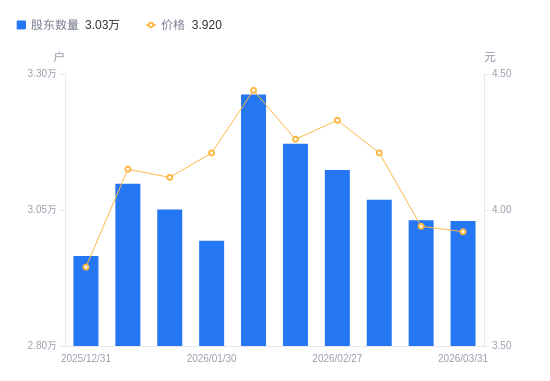 4月3日消息,数据显示,截至2026年3月20日,A股股东总户数为3.03万户,较上期(2026年3月10日)减少378户,降幅1.23%。公司最新A股总股本为13.4亿股,其中流通A股13.27亿股,户均持有流通A股数量为4.38万股,较上期增加539.12股,增幅1.25%;户均持流通A股市值17.25万元,较上期减少9548.55元,降幅5.25%。