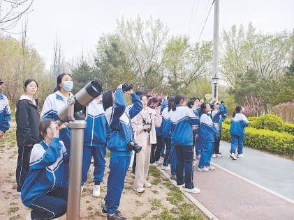 北京市第十二中学学生在庄怡乐学公园开展观鸟活动。