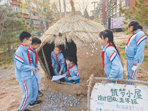 北京十一学校丰台小学的学生在乐学公园筑梦小屋里互动。