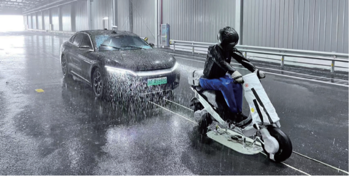 3.实车测试高精复现。为突破实车测试中场景复现难、精度差的制约,项目自主研发了系列高保真中国特征目标物(如打伞行人、快递三轮车)及驱动平板,目标物在100km/h高速下控制精度达国际先进的5厘米以内,形成了完整的国产化测试装备链,打破了国外技术垄断。