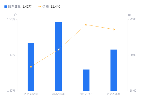 4月8日消息,数据显示,截至2025年12月31日,A股股东总户数为1.36万户,较上期(2025年9月30日)减少1328户,降幅8.90%。公司最新A股总股本为1.08亿股,其中流通A股1.08亿股,户均持有流通A股数量为7942.1股,较上期增加706.67股,增幅9.77%;户均持流通A股市值17.24万元,较上期增加2.55万元,增幅17.33%。