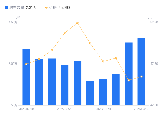 4月8日消息,数据显示,截至2026年3月31日,A股股东总户数为2.31万户,较上期(2025年11月10日)增加539户,增幅2.39%。公司最新A股总股本为1.56亿股,其中流通A股1.51亿股,户均持有流通A股数量为6507.22股,较上期减少220.06股,降幅3.27%;户均持流通A股市值29.93万元,较上期减少6958.85元,降幅2.27%。