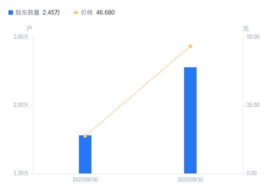 4月8日消息,数据显示,截至2025年12月31日,A股股东总户数为2.39万户,较上期(2025年9月30日)减少547户,降幅2.24%。公司最新A股总股本为2.68亿股,其中流通A股1.73亿股,户均持有流通A股数量为7216.66股,较上期增加161.42股,增幅2.29%;户均持流通A股市值30.32万元,较上期减少2.61万元,降幅7.92%。