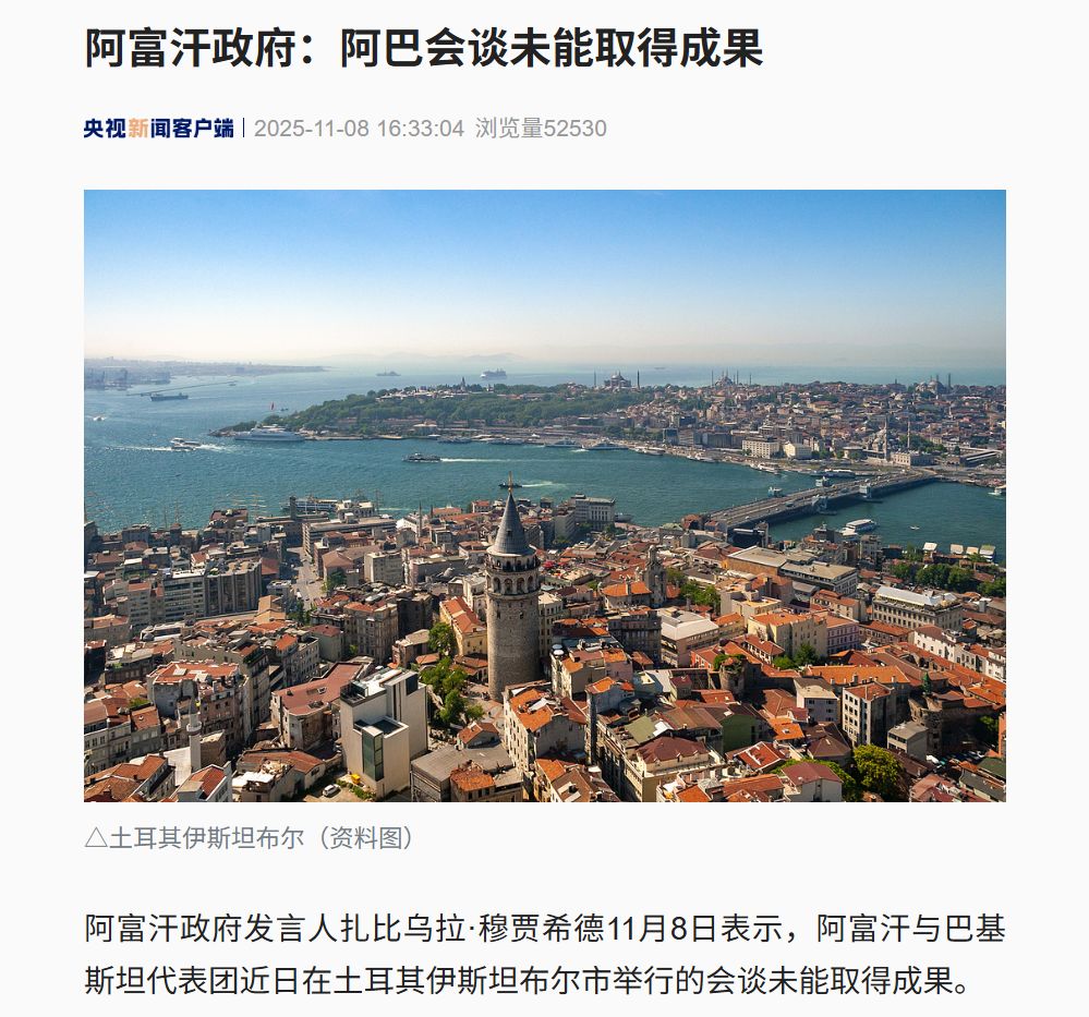 据央视新闻,阿富汗政府发言人扎比乌拉·穆贾希德11月8日表示,阿富汗与巴基斯坦代表团近日在土耳其伊斯坦布尔市举行的会谈未能取得成果。