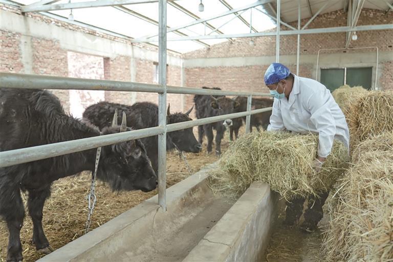 工作人员给牦牛喂饲料。资料图