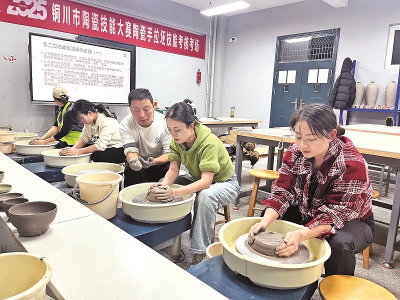 “手腕要稳,力度要均匀,感受泥土在掌心旋转的温度。”10月31日晚,铜川职业技术学院教室里,陶瓷设计与工艺专业老师宋皓东穿行在学员之间,耐心指导着陶瓷手工拉坯成型的技巧。教室里,学员们全神贯注,不断尝试着将一团团普通的泥巴变成精美的器具。