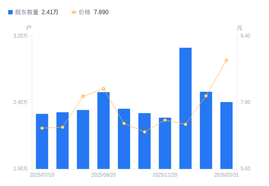 4月9日消息,数据显示,截至2026年3月31日,A股股东总户数为2.41万户,较上期(2026年3月10日)减少1231户,降幅4.87%。公司最新A股总股本为5.66亿股,其中流通A股5.23亿股,户均持有流通A股数量为2.17万股,较上期增加1056.97股,增幅5.12%;户均持流通A股市值17.14万元,较上期增加2.38万元,增幅16.16%。