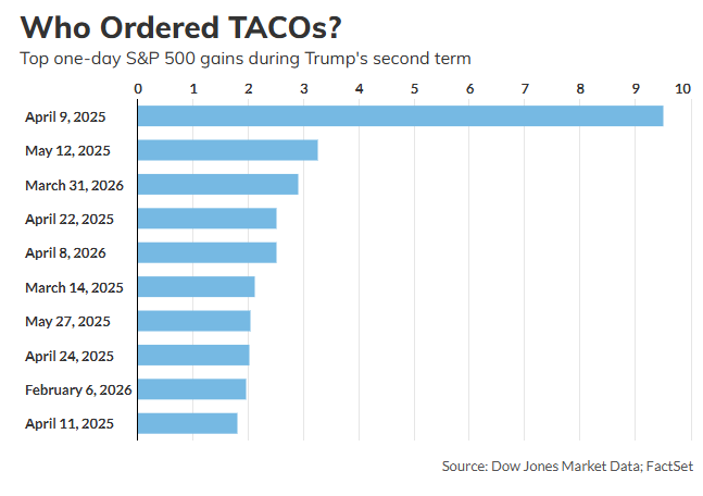 2025年4月9日: 这也是最初TACO交易的“成名之战”。特朗普当时表示,由于美国债券市场——用他的话说——“有点兴奋过头”,他宣布暂停实施大部分“解放日”关税90天。标普500指数随后在2025年4月9日上涨9.5%,创下16年来最大单日涨幅。