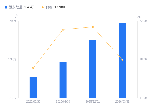 4月9日消息,数据显示,截至2026年3月31日,A股股东总户数为1.46万户,较上期(2025年12月31日)增加620户,增幅4.43%。公司最新A股总股本为2.06亿股,其中流通A股2.06亿股,户均持有流通A股数量为1.41万股,较上期减少623.41股,降幅4.24%;户均持流通A股市值25.32万元,较上期减少6.11万元,降幅19.43%。