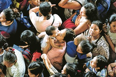 11月9日,在菲律宾马尼拉的一处疏散中心,一名女子亲吻孩子。