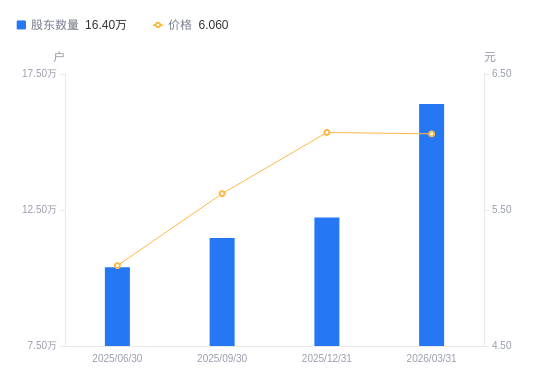 4月9日消息,数据显示,截至2026年3月31日,A股股东总户数为16.4万户,较上期(2025年12月31日)增加4.18万户,增幅34.19%。公司最新A股总股本为18.08亿股,其中流通A股18.08亿股,户均持有流通A股数量为1.1万股,较上期减少3768.86股,降幅25.48%;户均持流通A股市值6.68万元,较上期减少2.3万元,降幅25.60%。