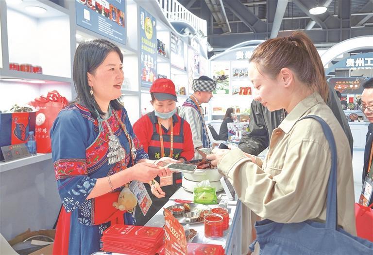在贵州老字号展馆进门的醒目位置,黔宝金店展示的非遗花丝系列产品,将传统手工编织技艺融入青花瓷元素,把国潮风“玩”出了新花样。“黔宝金店是百年老店,如何将民族文化与现代创新相融合,让贵州文化产品‘走出去’,是我们一直思考的问题。”黔宝金店品牌负责人黄梅介绍,经过多年布局,今年9月,该公司在丹寨县打造的“黔宝·国春非遗博览馆”开馆,内设非遗工坊、现代工坊,集旅游、参观、体验于一体。“民族的才是世界的,希望借助进博会,让更多国际友人了解贵州民族文化与手工艺品。”黄梅表示,该公司将不断创新设计,让传统与潮流共鸣,延续非物质文化遗产的生命力。