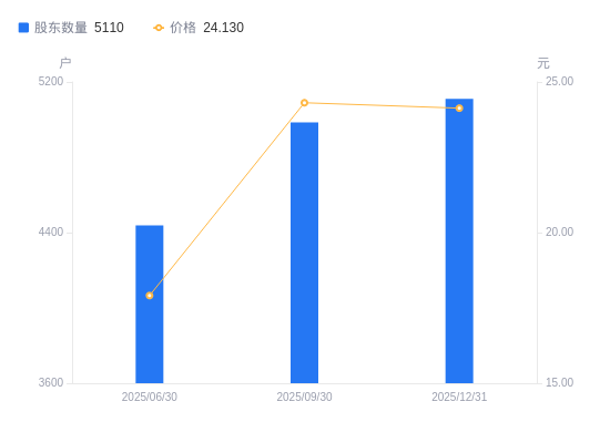 4月10日消息,数据显示,截至2025年12月31日,A股股东总户数为5110户,较上期(2025年9月30日)增加125户,增幅2.51%。公司最新A股总股本为7940.13万股,其中流通A股7940.13万股,户均持有流通A股数量为1.55万股,较上期减少511.89股,降幅3.19%;户均持流通A股市值37.49万元,较上期减少1.52万元,降幅3.91%。
