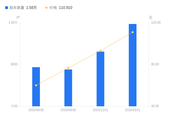 4月10日消息,数据显示,截至2026年3月31日,A股股东总户数为1.58万户,较上期(2025年12月31日)增加5291户,增幅50.53%。公司最新A股总股本为5.96亿股,其中流通A股5.96亿股,户均持有流通A股数量为3.78万股,较上期减少1.91万股,降幅33.57%;户均持流通A股市值419.39万元,较上期减少110.6万元,降幅20.87%。