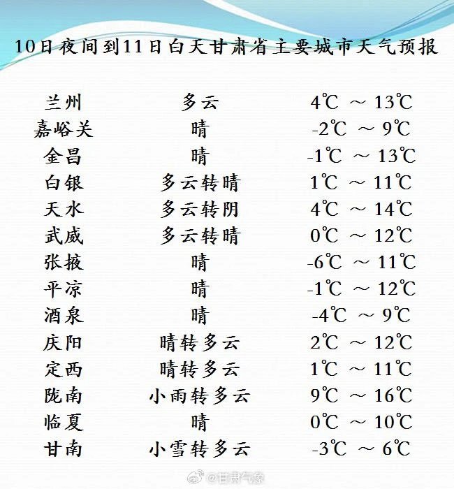 明天夜间到后天白天(11月11日20时—11月12日20时),甘南、临夏、定西三州市阴有小雪(雨),局部地方有中雪;陇南、天水、平凉三市阴间多云,部分地方有小雨(雪);省内其余地方多云或晴。