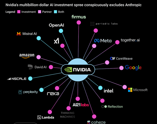 产业集中度同样令人担忧。CB Insights数据显示,英伟达几乎支撑着每一个主要AI参与者,除了Anthropic之外。这种高度集中的供应链结构放大了系统性风险。