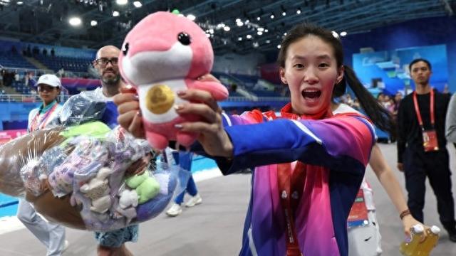 赛后,陈芋汐走向看台方向。那是许多从全国各地赶来的观众,尤其是不少专程从上海飞来的粉丝,把玩偶投向场地边,呼喊声、快门声此起彼伏。她举起手机,与看台做了一个“横跨场地”的大合影,此前她开心地与队友、教练逐一拥抱合影,对着镜头连连摆姿势,笑意难掩。这些细节,证明她是真的放松了。