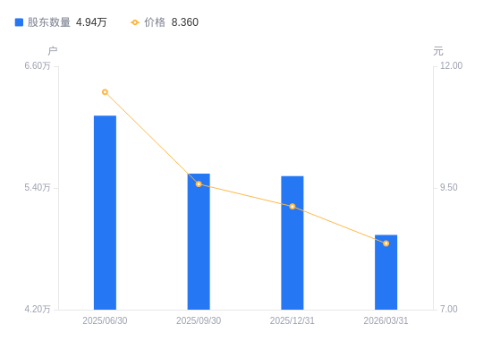 4月10日消息,数据显示,截至2026年3月31日,A股股东总户数为4.94万户,较上期(2025年12月31日)减少5799户,降幅10.51%。公司最新A股总股本为5.34亿股,其中流通A股3.77亿股,户均持有流通A股数量为7636.35股,较上期增加802.65股,增幅11.75%;户均持流通A股市值6.38万元,较上期增加1516.57元,增幅2.43%。