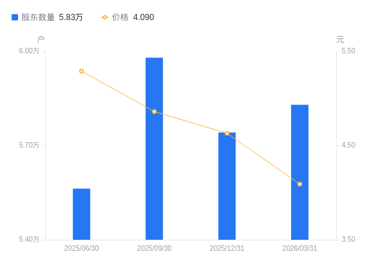 4月10日消息,数据显示,截至2026年3月31日,A股股东总户数为5.83万户,较上期(2025年12月31日)增加883户,增幅1.54%。公司最新A股总股本为13.05亿股,其中流通A股13.05亿股,户均持有流通A股数量为2.24万股,较上期减少344.16股,降幅1.51%;户均持流通A股市值9.15万元,较上期减少1.37万元,降幅13.00%。