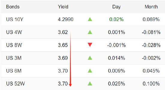 上图是美债收益率汇总图。从一个月期到一年期,美债收益率保持着从3.62%到3.7%的上升排序,意味着美联储在自四月份开始的未来12个月,大概率将保持紧缩货币政策。同时我们也注意到,未来12个月的利率升幅低于8基点,而美联储一次加息的幅度经常在25基点。所以美联储虽然在未来一年里存在紧缩货币政策的倾向,但付诸加息操作的概率较低。