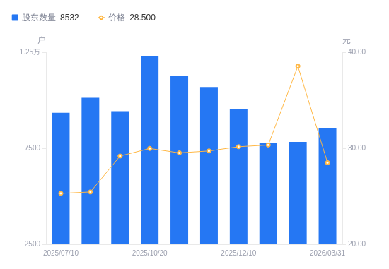 4月10日消息,数据显示,截至2026年3月31日,A股股东总户数为8532户,较上期(2026年1月30日)增加699户,增幅8.92%。公司最新A股总股本为7943.07万股,其中流通A股6027.37万股,户均持有流通A股数量为7064.42股,较上期减少630.41股,降幅8.19%;户均持流通A股市值20.13万元,较上期减少9.53万元,降幅32.13%。