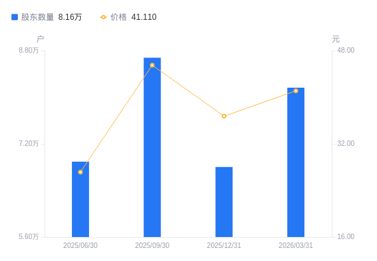 4月10日消息,数据显示,截至2026年3月31日,A股股东总户数为8.16万户,较上期(2025年12月31日)增加1.36万户,增幅20.00%。公司最新A股总股本为13.1亿股,其中流通A股12.32亿股,户均持有流通A股数量为1.51万股,较上期减少3017.8股,降幅16.67%;户均持流通A股市值62.02万元,较上期减少4.51万元,降幅6.78%。