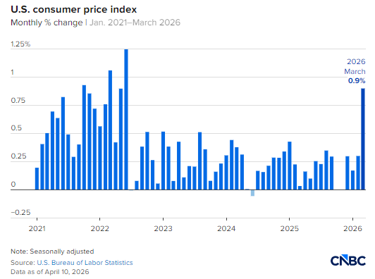 美国劳工统计局周五公布的数据显示,受伊朗战争引发能源成本飙升、美联储进一步远离通胀目标影响,3 月份消费者价格大幅上涨。不过,核心通胀相对温和。