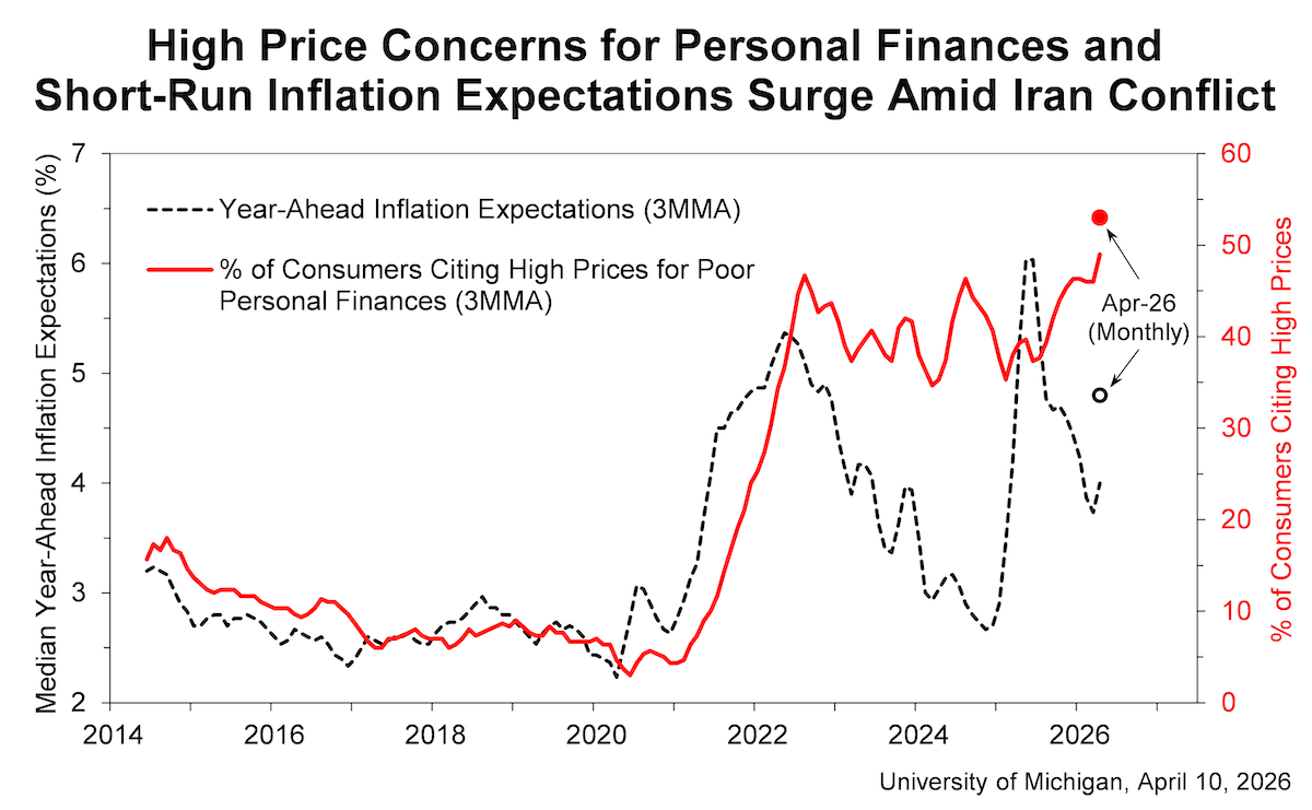 信心下滑之际,通胀预期急剧飙升:受访者预计未来一年物价将上涨4.8%,较3月读数跃升1个百分点,达到2025年8月以来的最高值。五年期通胀预期亦有所加快,至3.4%,环比加快0.2个百分点。