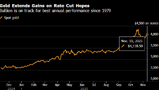 前一个交易日大涨了2.9%的黄金升至每盎司约4140美元。获得美国总统唐纳德·特朗普背书的跨党派协议最早有望在周三结束政府停摆。这一进展应该会让交易员更清楚地了解美联储何时会再次降息。