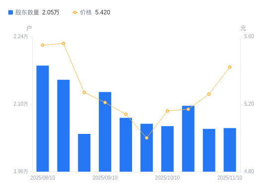 11月11日消息,数据显示,截至2025年11月10日,A股股东总户数为2.05万户,较上期(2025年10月31日)增加15户,增幅0.07%。公司最新A股总股本为6.82亿股,其中流通A股6.81亿股,户均持有流通A股数量为3.32万股,较上期减少24.3股,降幅0.07%;户均持流通A股市值17.99万元,较上期增加5182.9元,增幅2.97%。