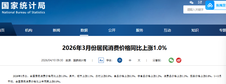 【环球网财经综合报道】国家统计局最新数据显示,2026年3月,全国居民消费价格指数(CPI)同比上涨1.0%,保持温和上涨态势;全国工业生产者出厂价格指数(PPI)环比上涨1.0%,同比上涨0.5%。值得关注的是,PPI同比在连续下降41个月后首次迎来转正,环比涨幅更是创下近4年新高。一季度物价整体走势向好,折射出宏观经济持续回升的积极信号。