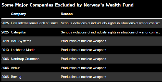 现行的道德准则禁止投资生产核武器或其零部件的企业。但与此同时,挪威政府加大国防开支,包含向BAE Systems Plc采购护卫舰、向采购F-35战斗机,而这两家公司都是挪威主权财富基金禁止投资的。