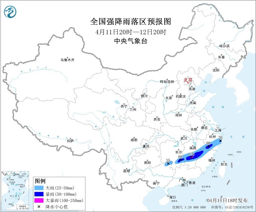 预计,4月11日20时至12日20时,浙江南部、江西中南部、福建西北部、湖南南部、广西东北部等地部分地区有大到暴雨,其中,江西中部等地局地有大暴雨(100~120毫米)。上述部分地区伴有短时强降水(最大小时降雨量20~40毫米,局地可超过50毫米),局地有雷暴大风或冰雹等强对流天气。