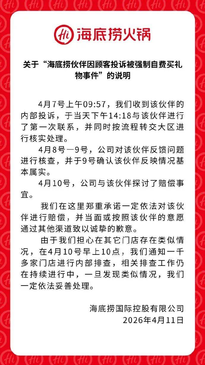 4月11日,@海底捞火锅 发布官方声明回应此事。声明指出,公司已于4月7日收到涉事员工的内部投诉,当日按流程转交大区进行核实处理;9日,经核实确认该员工反映情况基本属实。公司承诺将依法对涉事员工进行赔偿,并当面或按照该伙伴的意愿通过其他渠道致以诚垫的歉意。