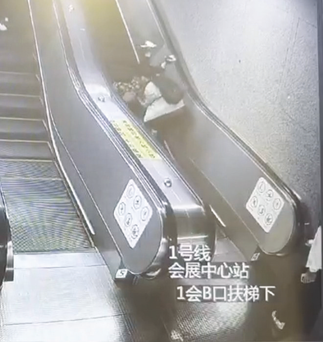 扶梯上,男生飞奔而来搀扶摔倒的老人。扶梯入口处,女生(右下角)按下扶梯紧急停止按钮。