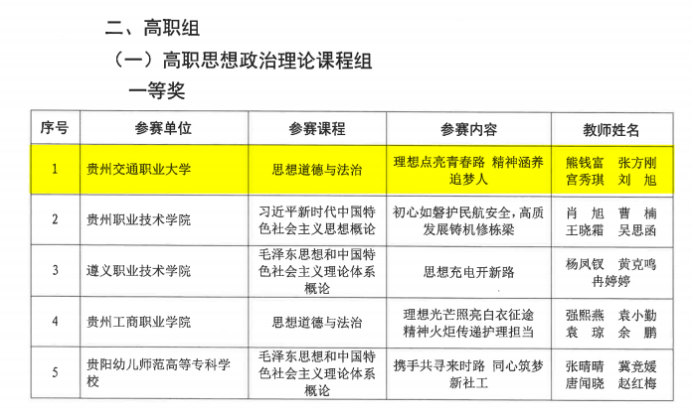 近日,2025年贵州省职业院校技能大赛教学能力比赛获奖名单正式公布。贵州交通职业大学马克思主义学院熊钱富、张方刚、宫秀琪、刘旭四位教师组成的《思想道德与法治》教学团队荣获高职思想政治理论课程组一等奖。