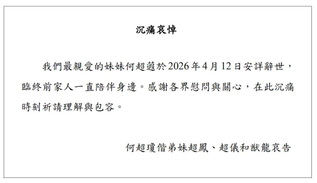 港媒报道称,信德集团已发出正式公告,证实何超蕸去世的消息。其家人在通告中称:“我们最亲爱的妹妹何超蕸于2026年4月12日安详辞世,临终前家人一直陪伴身边。感谢各界慰问与关心,在此沉痛时刻祈请理解与包容。”