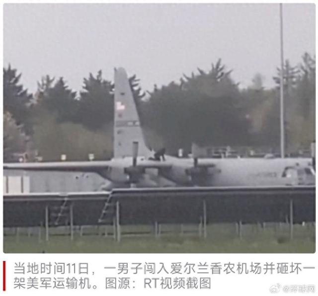 RT称,网上流传的视频显示,一名男子爬上了一架停放在该机场一条偏僻滑行道上的美军C-130“大力神”运输机,并疑似用斧头或锤子式样的工具砸向飞机机身。爱尔兰警方表示,嫌疑人是一名40多岁的男子,他擅自闯入机场禁区,随后被捕。